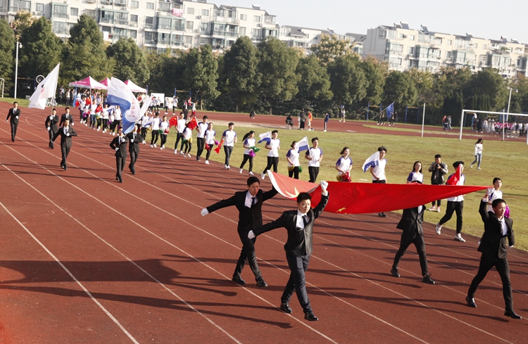 护卫队手持国旗、校旗、运动会会旗依次走过主席台