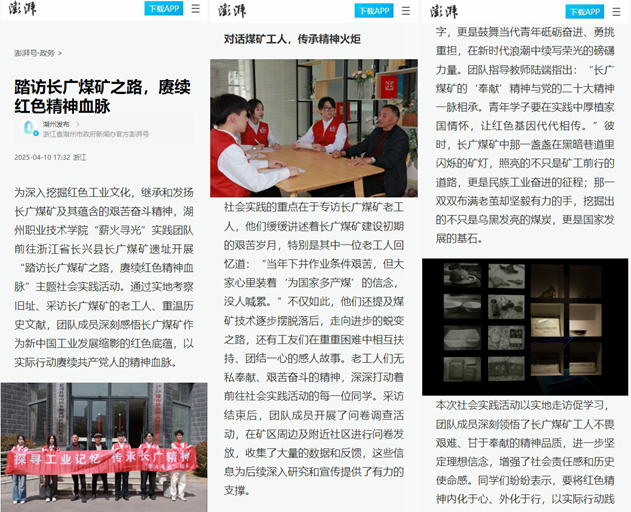 2025年4月10日《澎湃新闻》报道了我校“薪火寻光”实践团队前往浙江省长兴县长广煤矿遗址开展主题社会实践活动的相关新闻。