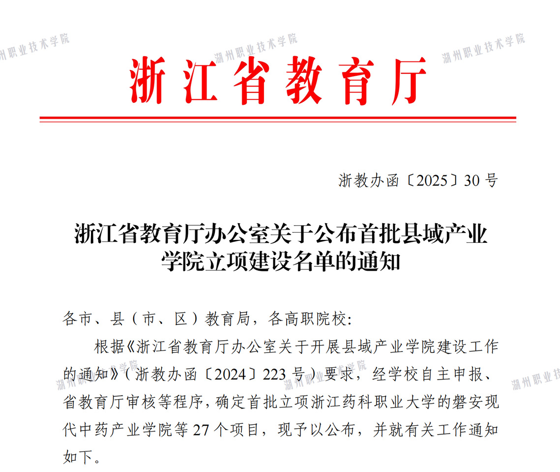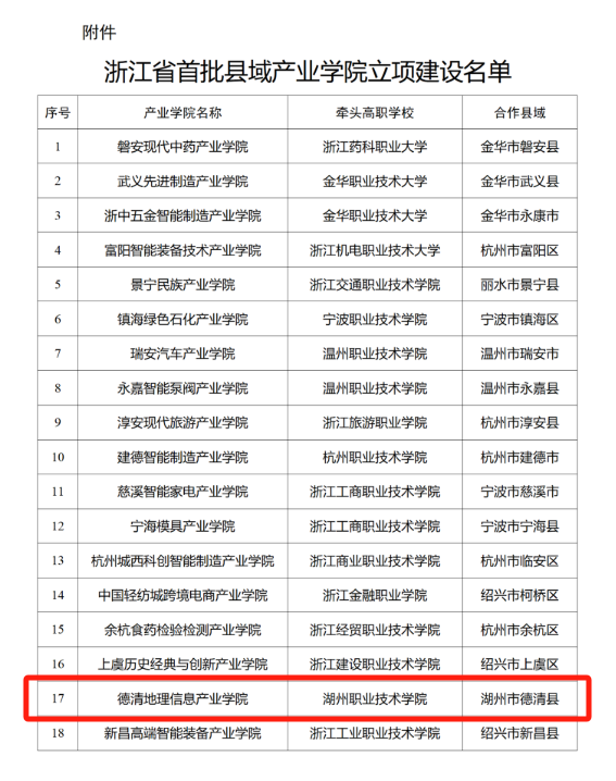 近日,浙江省教育厅办公室公布了首批县域产业学院立项建设名单,确定首批立项27个项目,由学校联合德清县人民政府、德清职业中等专业学校、德清60余家龙头企业申报的德清地理信息产业学院成功入选。这是学校在深化产教融合、助推县域优势产业发展的又一重要成果,更是学校在推动地理信息产业与教育深度融合方面取得的重大突破。