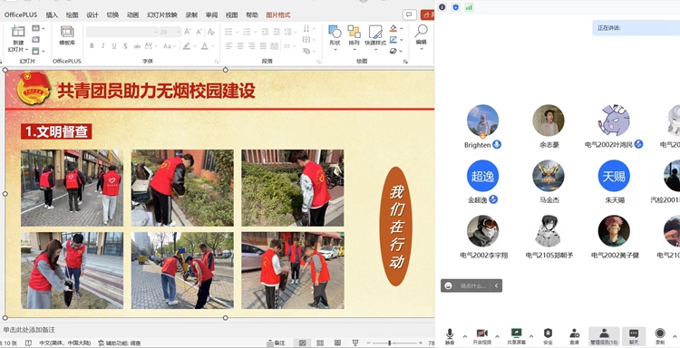 5月上旬,学院组织近60名学生开展“文明校园,一‘汽’共创”主题云团课。团课围绕近期校园禁烟、文明巡逻、垃圾分类等工作,总结文明创建工作中存在的不足,并号召大学生从自身做起,争做文明典范。过程中,大家积极进行互动,电气2103班团支书卢江涛说道,“助力文明校园创建,是每位大学生应尽的职责,我们要牢记社会主义核心价值观,争做新时代文明大学生。”