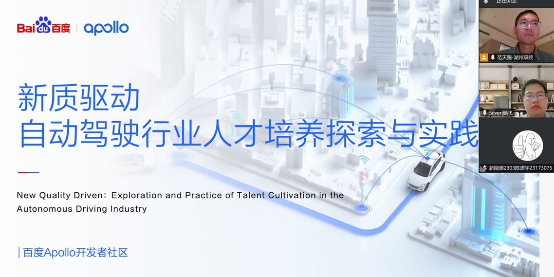 为更好地服务湖州智能网联汽车产业发展,提升专业建设内涵,并深化产教融合,加强校企合作,7月11日,新能源工程与汽车学院智能网联汽车技术专业与百度Apollo举行了线上校企taptap亚洲体育投注网会。百度Apollo校企合作负责人、智能网联汽车技术专业负责人及部分学生共同参与了此次交流。