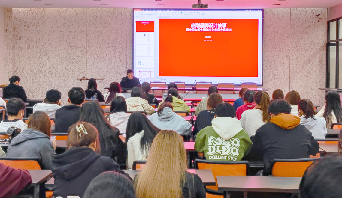 首期嘉宾邀请到了来自湖州师范学院艺术学院教师、浙江共创伟业文化创意有限公司主理人——赵刚,进行主题为“赵刚品牌设计故事——暨全国海洋大中学生海洋文化大赛宣讲”的分享。讲座从“自我成长、专业修为、时代嗅觉等三方面分享了赵刚老师的品牌设计故事。讲座第二节为师生们做了《全国大学生海洋文化创意设计大赛》宣讲,详细介绍了海洋文化创意设计大赛以及2023年赛事“未来海洋”的主题解读。讲座干货满满,掌声不断,同学们获益匪浅。讲座最后的提问环节,同学们积极发言提问,嘉宾老师针对同学们的提问进行一一解答,讲座在热烈的掌声中结束。